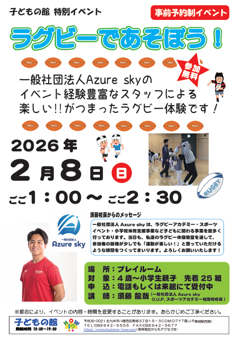 「ラグビーであそぼう!」☆予約受付中☆ 2026.01.25(日) お知らせ 重要なお知らせ 親子で楽しくラグビーを体験できるイベントです♬体を思いっきり動かしてみませんか? 開催日時:令和8年2月8日(日)13:00~14:30 場所:プレイルーム 対象:4歳~小学生親子 定員:25組 料金:無料 申込:電話(642-5555)もしくは来館にて 詳しくは子どもの館までお問い合わせください(tel:093-642-5555)