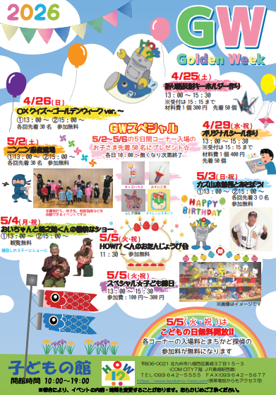 ★GWイベントのお知らせ★ 2026.04.11(土) お知らせ 重要なお知らせ GW中は毎日イベントを開催します☆ 5/5(火・祝)はこどもの日無料開放日!! 各コーナーの入場料とまちかど探偵が無料になります♪ 5月のイベント情報も公開しております。詳細は下記のチラシをご確認ください。 ★GWのチラシはこちら↓